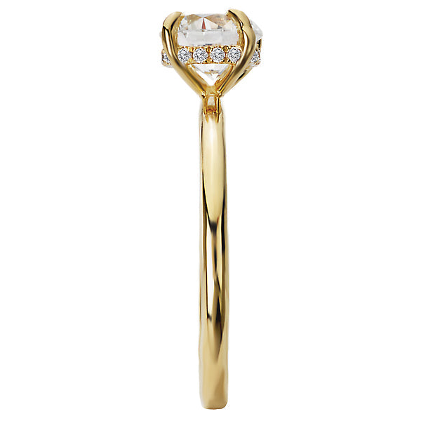 This 14kt yellow gold semi-mount engagement ring has a hidden halo of diamonds underneath a center setting that will accommodate a 6.5mm round diamond. (D .06 carat total weight)